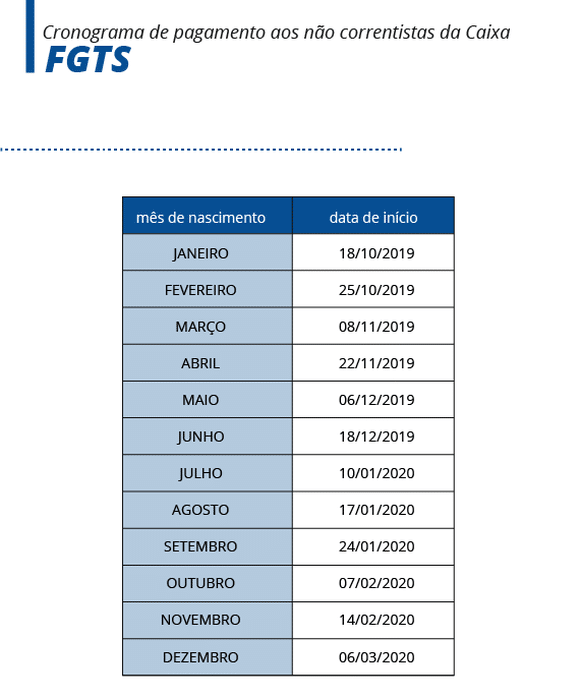 Para aqueles que não têm conta na Caixa, o calendário começa no dia 18 de outubro, para os nascidos em janeiro, e vai até 6 de março de 2020, para os nascidos em dezembro:
