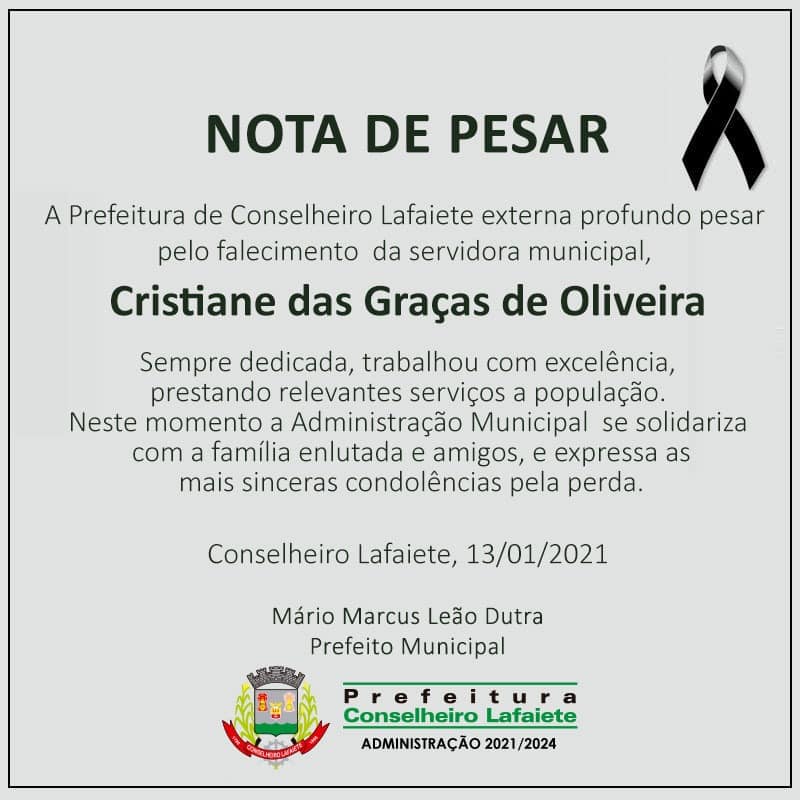 A Prefeitura de Conselheiro Lafaiete publicou nota de pesar pelo falecimento de Cristiane das Graças de Oliveira. Segundo informações, Cristiane era funcionária da Secretaria Municipal de Obras.
