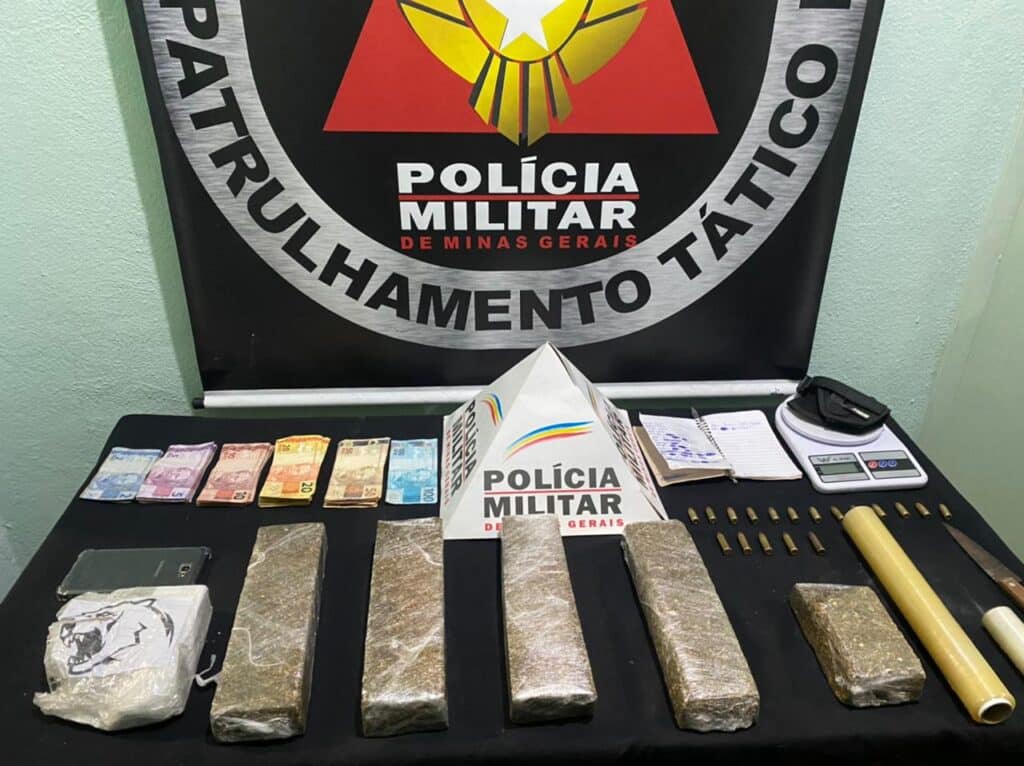 Foram apreendidas, quatro barras de substância análoga a maconha e uma barra fracionada da mesma droga. Também foram localizadas, uma barra fracionada de substância semelhante à cocaína, 13 munições calibre .9 mm, cinco munições de .38, um coldre de arma de fogo, 01 uma balança de precisão, a quantia suspeita de R$ 2.780,00, um aparelho celular e outros materiais utilizados no tráfico de drogas, dentre eles um caderno de anotações da traficância.