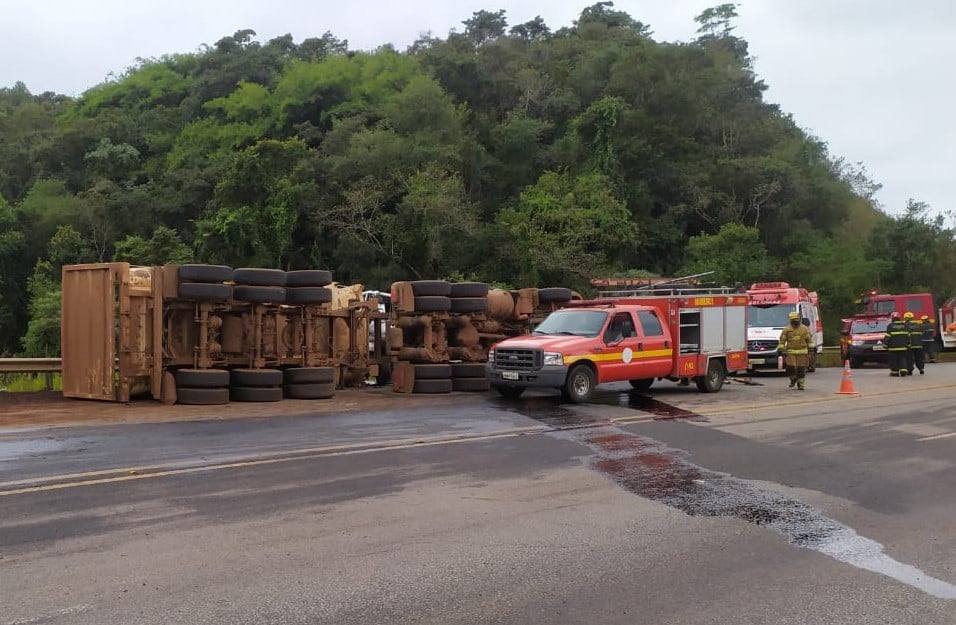 Quando os bombeiros chegaram no local, os veículos estavam tombados na pista. Um homem de 24 anos, condutor da carreta que transportava minério de ferro, além do motorista do caminhão guincho estavam presos às ferragens.