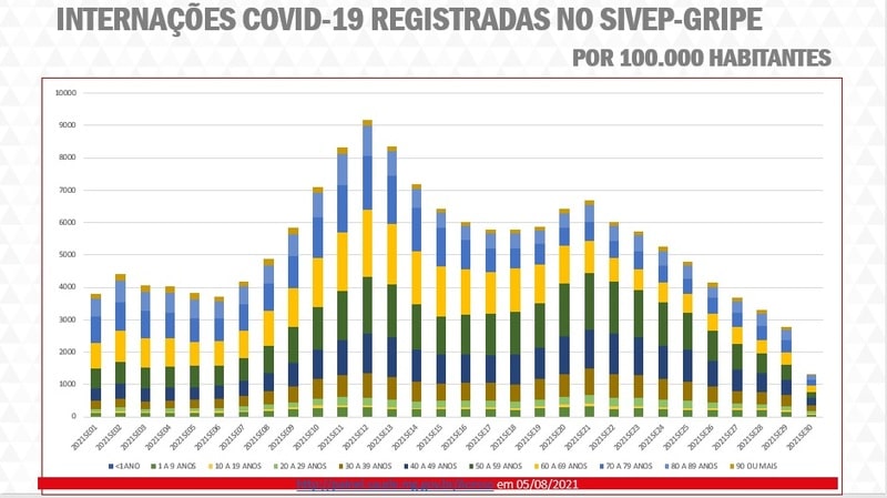 O secretário de Estado de Saúde, o médico Fábio Baccheretti, destacou na quinta-feira (5/8), em coletiva na Cidade Administrativa, em Belo Horizonte, a importância da vacinação e a eficácia dos imunizantes para a redução do número de internações e de óbitos pela doença no estado. Baccheretti apresentou o gráfico das internações por Covid-19 em Minas, com as proporções para faixas etárias, de 3/1 a 31/7/2021.
