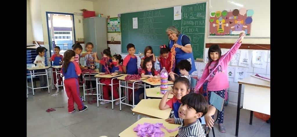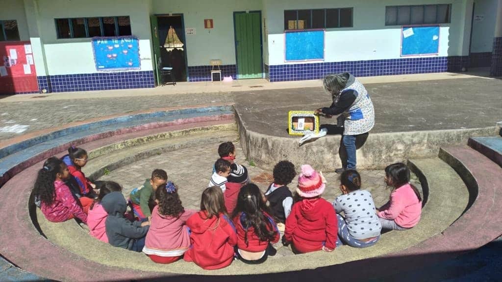 As crianças dramatizam as histórias. Tem sido muito importante para o desenvolvimento delas. No turno da tarde o projeto é desenvolvido pela analista educacional Marli com todas as turmas, do berçário até o segundo período.