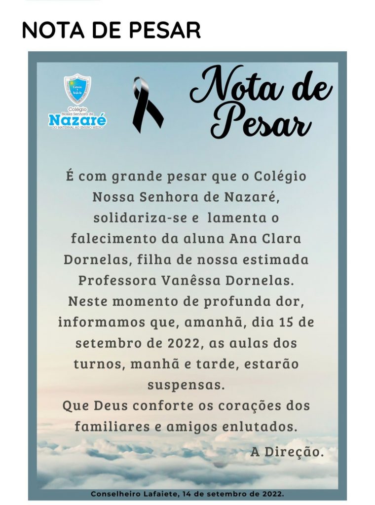 O Colégio Nossa Senhora de Nazaré em Conselheiro Lafaiete está de luto. A instituição de ensino manifestou em nota o pesar falecimento da aluna Ana Clara Dornelas, filha da professora Vanessa Dornelas.