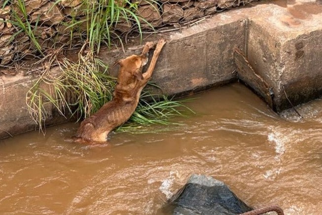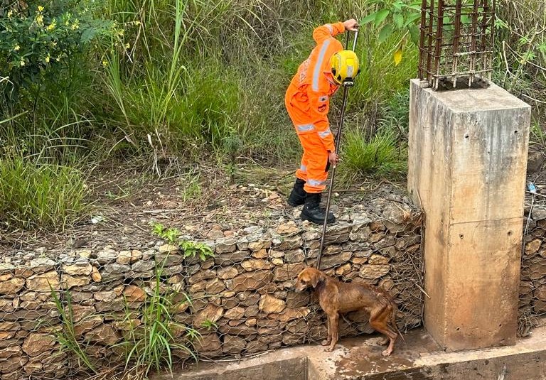 Militares do Corpo de Bombeiros de Congonhas em retorno de uma ocorrência pela manhã do domingo 30/04, depararam com um cão dentro de um córrego de acesso ao rio Maranhão. Segundo os bombeiros, o animal estava tentando subir para margem.