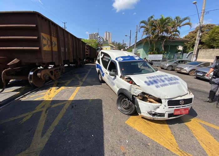 A composição atingiu a parte dianteira do veículo. O passageiro conseguiu saltar do veículo e sofreu apenas escoriações.