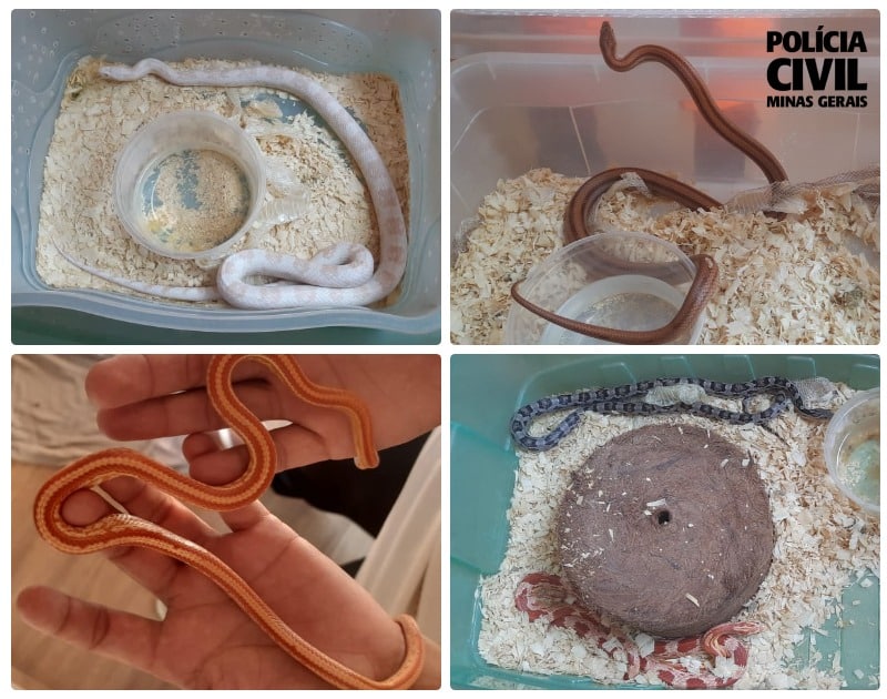 Em outro imóvel, a equipe da polícia localizou algumas cobras mantidas em cativeiro, sendo constatado que os animais estavam em locais inadequados e sem a devida higienização. O proprietário das cobras, de 25 anos, foi preso em flagrante pelo crime de maus-tratos. O Corpo de Bombeiros Militar também foi acionado para fazer o recolhimento dos animais, que posteriormente serão encaminhadas ao Centro de Controle de Zoonoses da cidade. Os presos foram conduzidos à Delegacia de Plantão e em seguida, ao sistema prisional.
