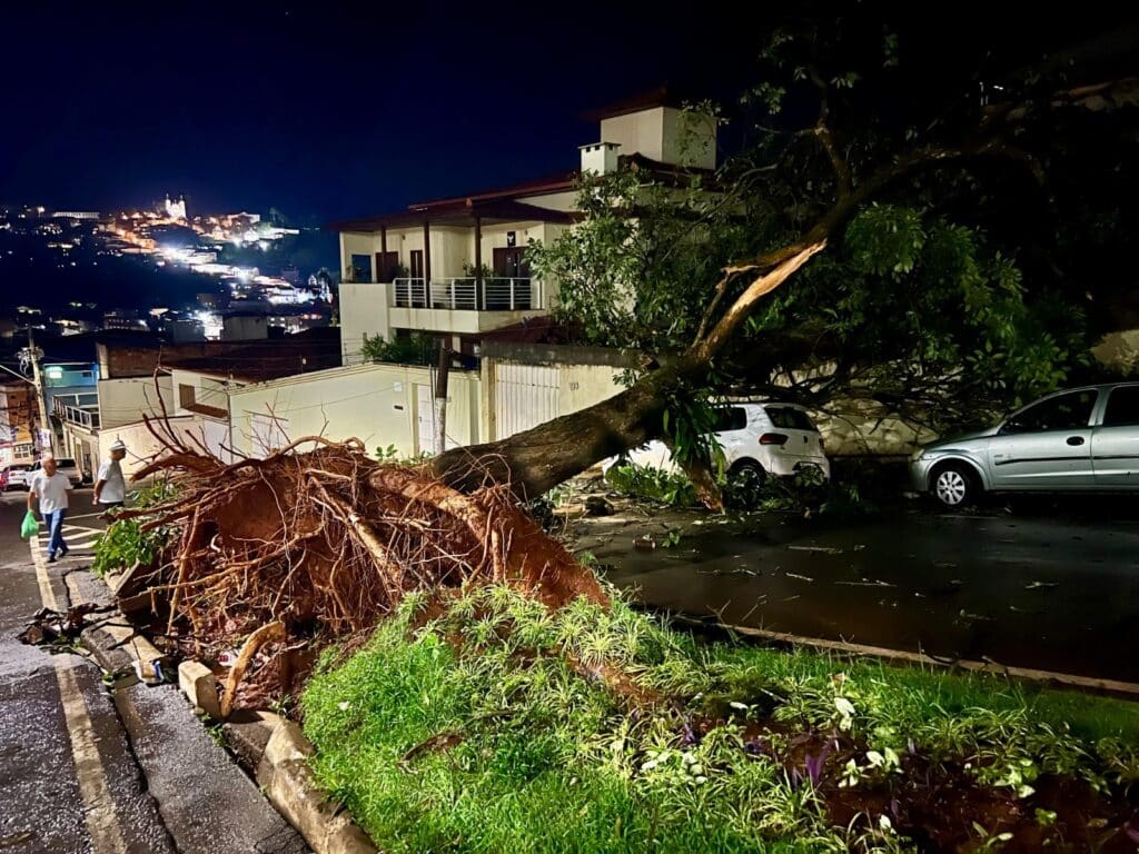 Na Matriz, um ipê de grande porte que existia há cerca de 40 anos na pracinha da rua Padre Alcides, do lado do Cemitério Nossa Senhora de Conceição, caiu sobre veículos, o muro de uma casa e partiu um poste. A CEMIG também está no local para fazer o reparo e restabelecer a energia na Matriz. Um pouco acima, na altura do ginásio coberto do Colégio Nossa Senhora da Piedade um galho de uma outra árvore também caiu sobre a via e veículos estacionados.