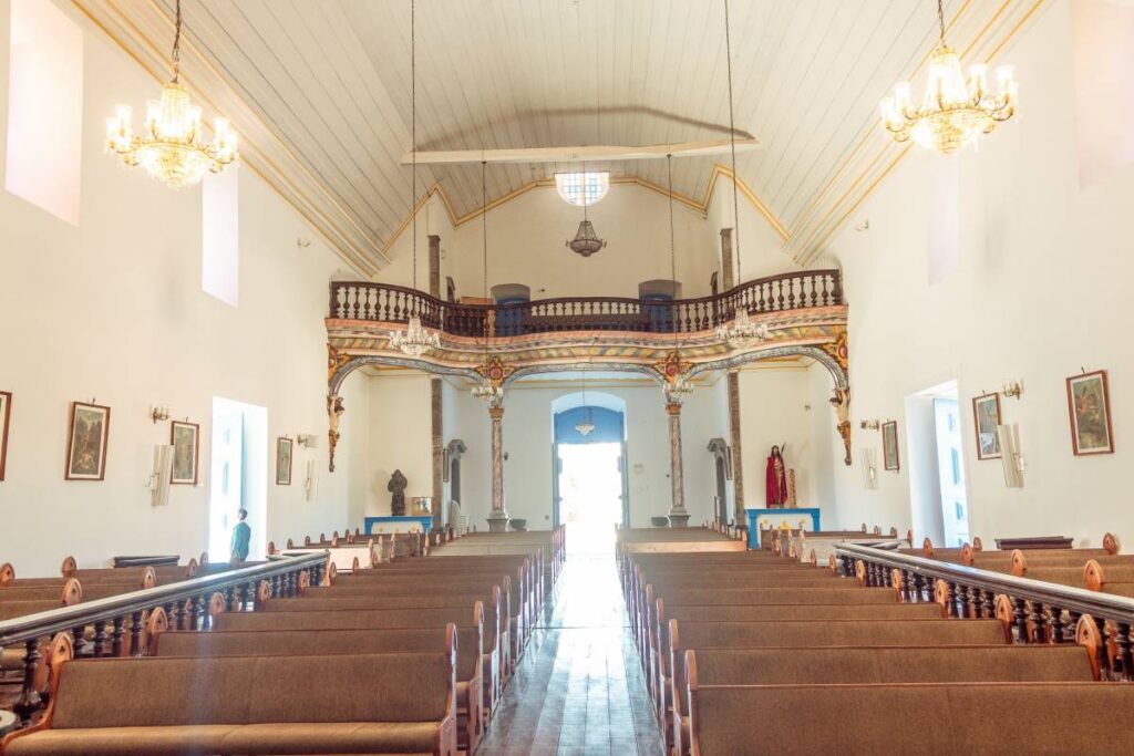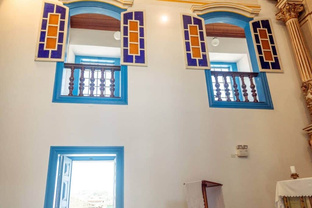 Entre os serviços executados estão o lixamento e a higienização das paredes, a limpeza de elementos arquitetônicos, a pintura com tinta mineral, além da recuperação de rebocos e do tratamento das esquadrias. Durante o acompanhamento da obra, foi possível identificar a necessidade de intervenções pontuais em diferentes elementos, não previstas no escopo inicial da emenda impositiva, as quais estão sendo executadas como contrapartida pela própria Paróquia. Tais intervenções vêm sendo devidamente acompanhadas e orientadas pelos órgãos de proteção, de modo a garantir não apenas a preservação dos elementos afetados, mas também a continuidade adequada dos serviços de pintura. Os serviços apresentam evolução satisfatória, com manutenção adequada das medidas de proteção ao acervo e ao mobiliário.