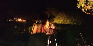 Neste sábado, 1º de maio, a carreta bitrem foi retirada do local onde houve o desabamento da ponte na entrada da cidade de Casa...